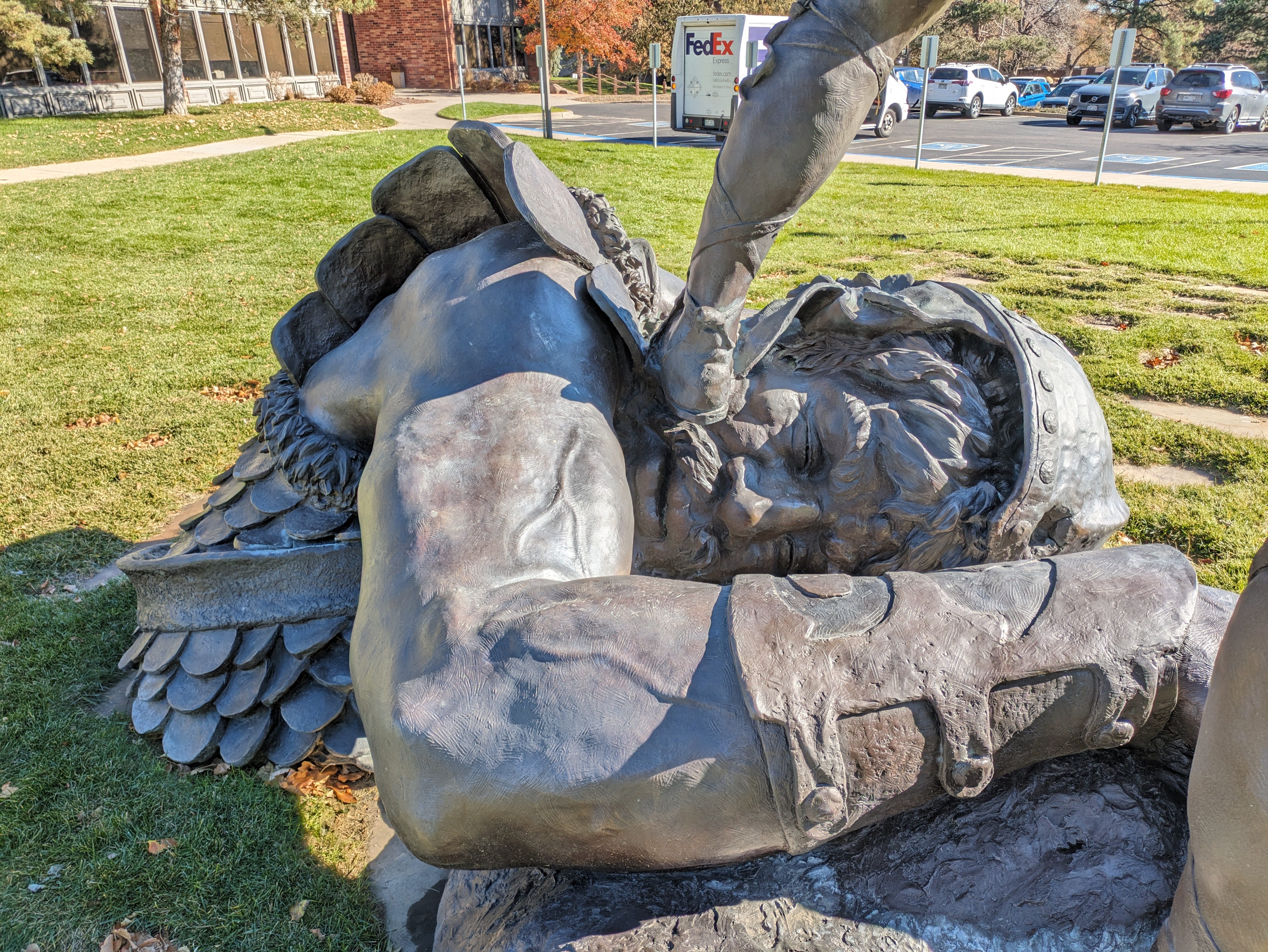 I found a statue of a fallen man. He was a villain, so I was surprised by how deeply it portrayed his humanity. He looks hurt. He looks like he was once a person. He looks like he can’t sleep well, because his back is old and starting to go and he can’t find a way to lie on his side without crushing his shoulder, and sleeping out in the battlefield is just the pits… he wants to go home. Why did his leaders bring him out here, to fight these people? Because he’s big?