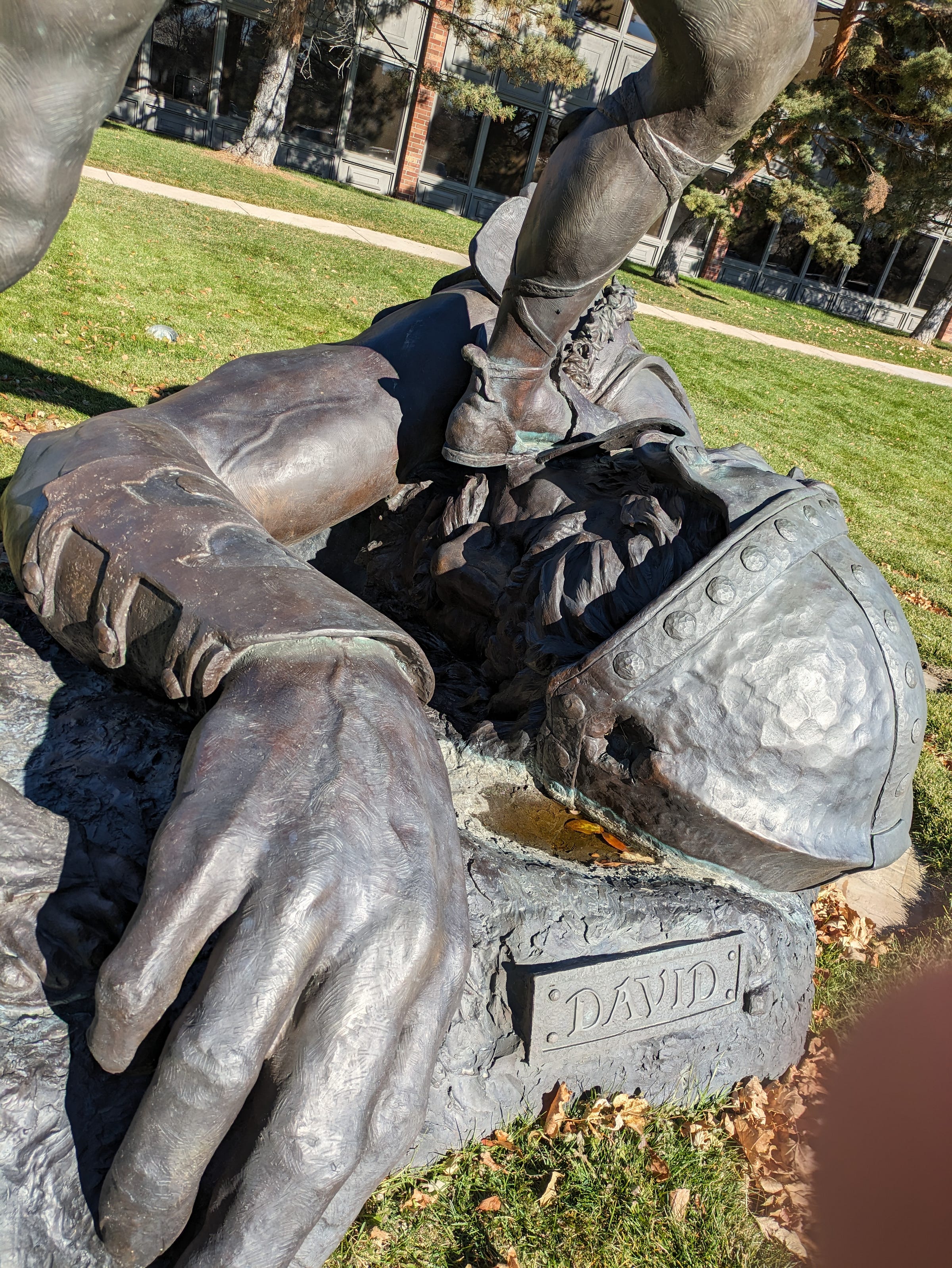 David is tiny in comparison, but the statue still towers over me. My head comes up to his crotch and I’m over six feet. Goliath is absolutely massive. It’s a good statue—the giant is intimidating even lying dead on the ground. It makes you really look at that single little hole in the helmet. The leather strap that flung a smallish stone.