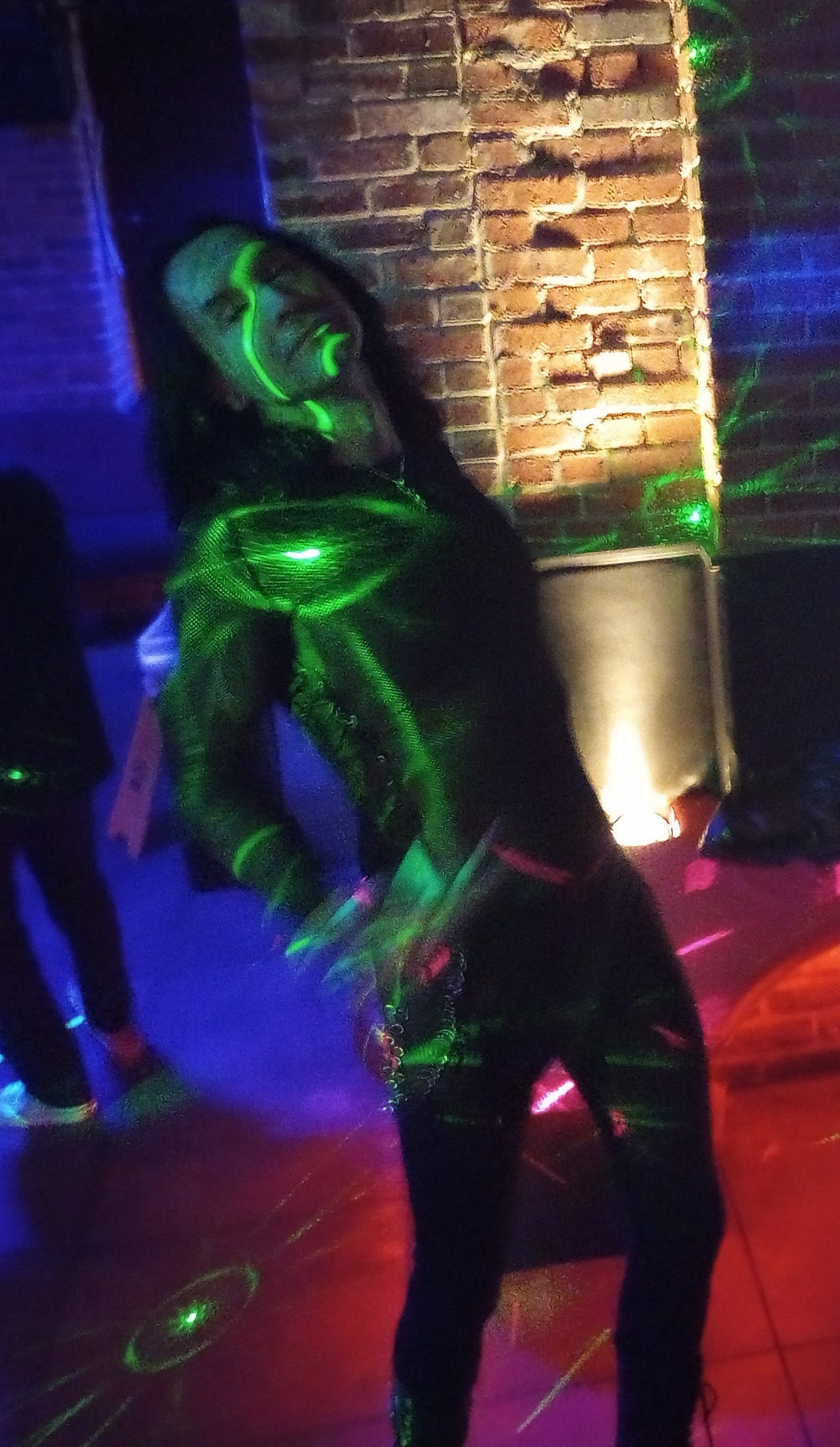 Dance is mostly solo. You do your own thing on the floor, move however the music makes you want to move. It’s usually easier to ease into it with rocking or stepping side-to-side, and head-nods. Everyone finds their own groove and everyone dances different, to the point that I am tempted to post about how one’s dance style at a goth club is almost a fingerprint. You can tell who’s dancing at a distance once you know them just by the way they’re moving.