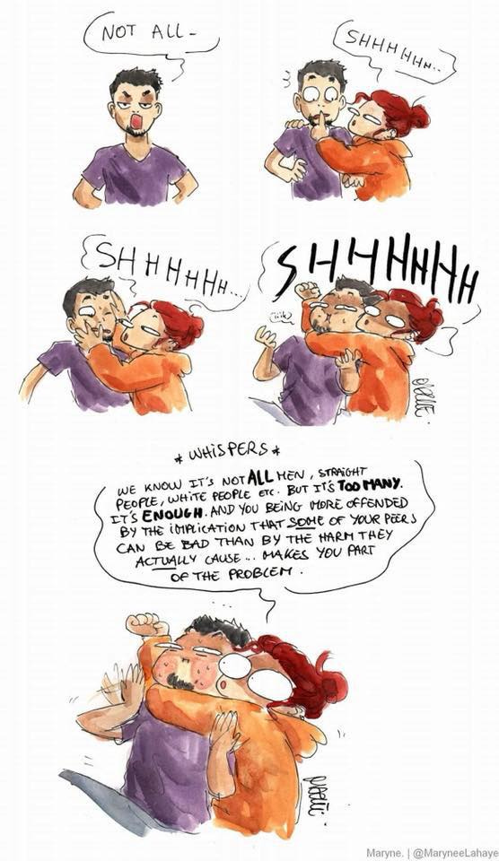 [Critics of the comic] appear to believe that the girl in the comic, and those she represents, is a bigot who speaks in "all X are awful" generalizations for any group, from white people to men to heterosexuals. This is missing the point. [“Not all X”] statements are meant to derail. I see them ALL the TIME in response to people NOT saying "all." You want her to defend herself from an unfair accusation instead of explaining her rationale by insisting that her not adopting the language of the accuser is proof of guilt. I'm pretty sure the artist didn't have her specifically say those words because it's so obvious to them that the accused don't say all in most of these cases that pointing it out is redundant to the actual message being conveyed.