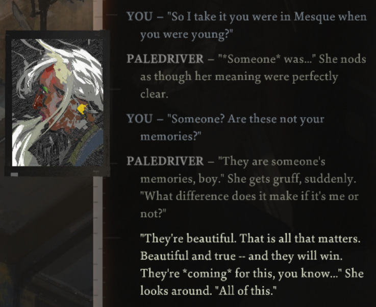I know it’s just a game. But I needed it. It gives me hope. If Harry Du Bois can pick up his pieces after his ex left him… if he can stumble into a moment of grace and beauty like that in the middle of goddamn Revachol, holding those pieces in his hands…