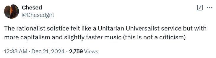 The Bay Area Solstice also has significant production value. This isn’t an ad hoc celebration by rationality fans anymore, it’s a polished production akin to a TED event with music. It’s legitimately impressive, and that makes it a good public-facing event. I suspect at least part of the Unitarian Universalist vibes are due to the knowledge it’ll be seen by others. Like, we mostly don’t care, because we’re singing with tears in our eyes about curing death and aging and expanding across the stars… but also, this is the least socially-offensive way that could possible be done. No one hates Mister Rogers, and the Unitarian Universalists are the Mister Rogers of religion. If we’re gonna be heartfelt and emotional and celebrate our culture in a public manner, this is a great way to do it.