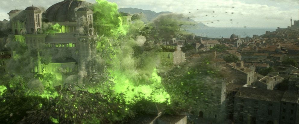 Daenerys, our parody of the White Savior that manages to fuck up everything and become a committer of atrocities, is now just a plain old White Savior again. She left behind her smashed society so we don't have to see it anymore, and instead she just rides in to save the people of Westeros. Without destroying their society. Without committing atrocities. Without any moral compromise at all, just good ol' Saving The World. Narrative candy.
