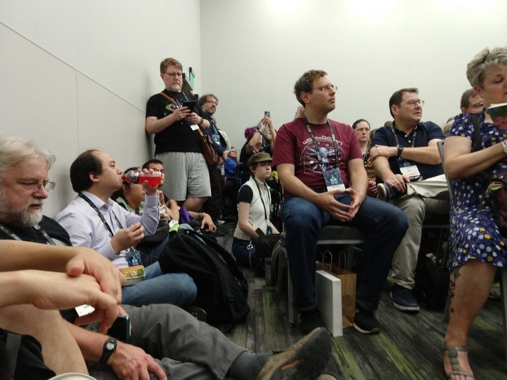 I was invited back to another discussion the next day, and my biggest regret is not going to that. At this point I’d already missed a lot of programming I had meant to go to, either to catch up with friends, or to go to the Palmer events (I found out about them last-minute). And I really wanted to go, but I also felt like I should try to go to some programming for realsies one day? So I ended up sticking with the panels I’d picked out of the guide. That wouldn’t have been a mistake if there WASN’T more Ada Palmer to be had. But there was, and I deeply regret my decision now. :( Best heuristic – always go fan out over/with the person(s) you most admire in a con. It feels incredible because this is how we evolved to make good super organisms. It is doing a good thing to pay your heroes with admiration!