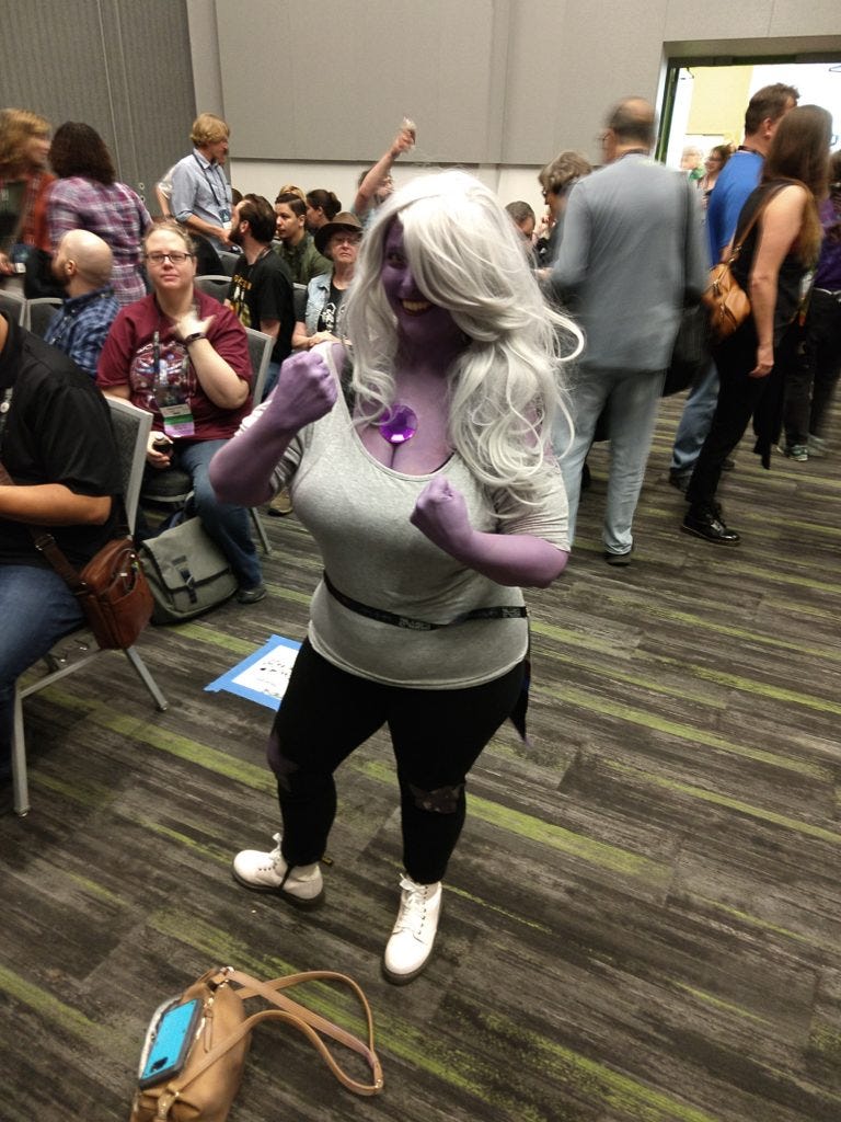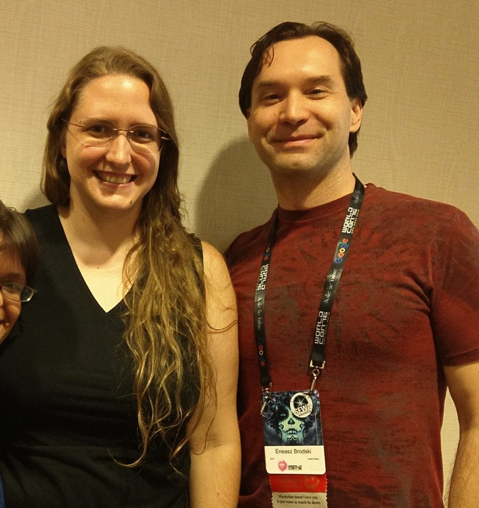 One thing I did notice about this year though… aside from my amazing experiences with fanfic panels and Ada Palmer, I felt much more detached and less joyful this year. Always before I’ve been super extroverted and fully engaged. This year I had some melancholy. I think… I kinda think it’s because in all previous years I thought of myself as an SF fan. And this year I thought of myself as an author… except that I’m not a successful author (yet?). No novel. Only a few short stories. I’m surrounded by famous authors rocketing into their careers, and I haven’t done much. These people know each other, but no one knows my name, and I feel like I don’t belong. I want to no longer just be a fan of The Thing, but be an active participant and doer of The Thing. I kinda feel like I should sit out the next few WorldCons until I actually DO something to earn it. But fortunately the next two will be out of country and beyond my financial means to attend anyway, so I guess I don’t have to worry about deciding that.