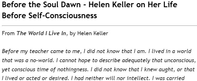 "I lived in a world that was a no-world. I cannot hope to describe adequately that unconscious, yet conscious time of nothingness. I did not know […] that I lived or acted or desired. […] I was carried along to objects and acts by a certain blind natural impetus. I had a mind which caused me to feel anger, satisfaction, desire. […] I never contracted my forehead in the act of thinking. I never viewed anything beforehand or chose it. […] My inner life, then, was a blank without past, present, or future